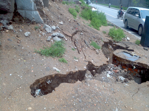 12日一早地测学院暑期社会实践队全体成员就离开了宾馆开始了一天的行程。由于大同市近几年在进行大同古城的复原工程,因此大同市的建筑呈现出拆迁混乱的场景。因为古城在进行复原工作,因此,对地裂缝的治理工作就显的更加的重要。所以,队员们的工作就是对古城附近的地裂缝治理情况进行调研。