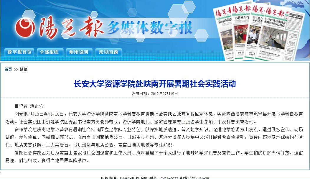 7月13日至7月18日,长安大学资源学院赴陕南地学科普教育暑期社会实践团奔赴陕西省安康市岚皋县开展地学科普教育活动。社会实践团由资源学院团委副书记查方勇老师带队,资源学院地质、旅游管理等专业15名学生参加了本次科普教育活动。