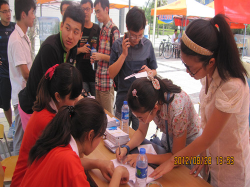 8月27日 晚的迎新准备会议过后,我院团委学生会的男生们就到树蕙园广场长安花的旁边搭帐篷支起了迎新点。28日早上9:00,团委学生会的工作人员又在迎新点开始了摆桌子、拉横幅等准备工作,中午12:30,团委学生会所有人员在迎新点集合,正式开始了新学期的迎新工作。