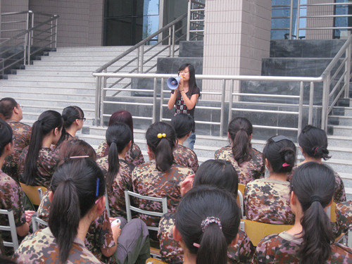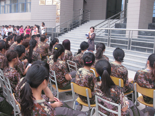 晚上19:40分,新生见面会圆满结束,我院12级新生在党委副书记范婷的带领下去往朝晖体育场门口参加军训动员大会。