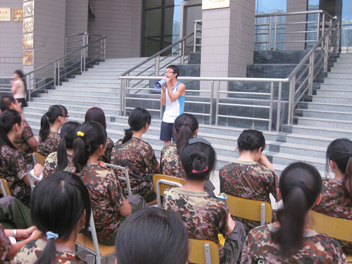 首先团委副书记张建男在发言中强调同学们最重要的任务仍然是学习,并希望大家都能取得优秀的成绩。主席张清雅则更多地表示了她对12级新生军训生活的关心,科协主席在简要介绍了科协的职责之后希望大家能积极踊跃报名,青年志愿者服务分队主席姚梅丹跟新生分享了军训经验,希望大家不管有什么困难都一定要坚持下去,并同大家一起高唱《水手》的高潮部分来鼓舞士气。接下来各个部长依次上台简短介绍部门职责,并对大家的加入表示欢迎和期待。