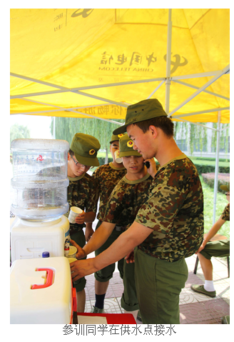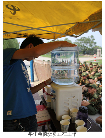 自新生军训开始,机械学院学生会就对慰问和服务非常重视,由主席吴赛赛亲自安排,进行了一系列的后勤保障工作,而此次设置供水点更是深受参训师生的好评。学生会每天安排专人值班,负责供水点的管理工作,保证在炎炎烈日下训练的师生能够在第一时间喝到清凉的水。考虑到许多教官由于高声发令指挥而声音嘶哑,学生会还特地为他们准备了热水和祛火的菊花,以及一些润喉的药品。