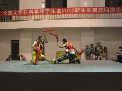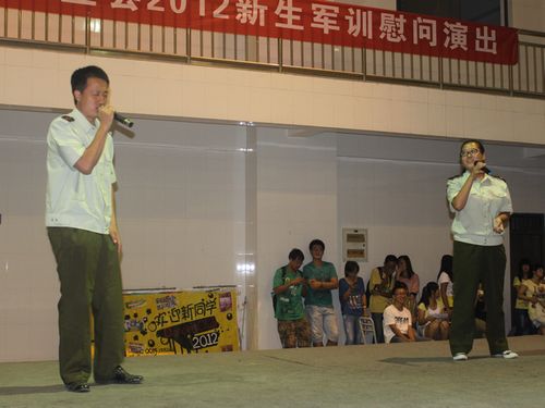 随后,晚会正式开始。首先大艺团带来的相声节目《我的单身生活》,诙谐幽默地表演逗得大家捧腹大笑,仿佛一下洗去了同学们连日军训的疲惫。紧接着,街舞社团也带来了活力四射的街舞表演。当然,慰问表演的舞台上也少不了12级新生稚嫩的面孔,无论是小提琴独奏,还是精彩的斗舞秀,都给大家耳目一新的感觉。高书记、何老师、刘老师以及况老师的两组深情对唱更是将晚会推向了一个高潮,赢得现场一片欢腾叫好,随后承训教官们帅气的腰鼓表演让同学们拍手称赞。