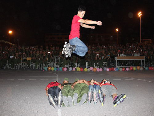 我院和资源学院12级新生19:00便集合完毕,由教官带队入场。19:30,黄土地文化社的腰鼓表演为此次慰问演出拉开了帷幕。随后资源学院党委副书记、军训师政委薛冬钧致辞,表达了对承训教官的感谢以及对大一新生优秀表现的鼓励和表扬,同时对两院领导和此次慰问演出的工作人员表示感谢。紧接着,主持人宣布慰问演出正式开始,现场一改严谨的军训气氛,响起热烈的掌声和口哨声。随后,校园之春优秀选手徐渊博带来歌曲《内疚》;轮滑协会带来花式轮滑,他们娴熟高超的技术引得现场的同学阵阵惊呼;第九届渭水之星冠军Eureka乐队带来英文歌曲并与学弟学妹们分享大学心得,“在大学要干你喜欢干的事,要把大学过得精彩”;动漫协会的cosplay更是激起大家的兴趣,同学们纷纷举起手机拍照。几天的军训,并没有磨灭他们的青春活力,在互动环节当主持人问大家“知道学生会的口号是什么吗?”大一新生异口同声说:“为人民服务!”连教官都被逗乐了。在这一环节中,大一新生也积极参与表演才艺,两名男生的口技表演更是精彩,赢得大一新生尖叫欢呼,学姐学长们也都热烈鼓掌。