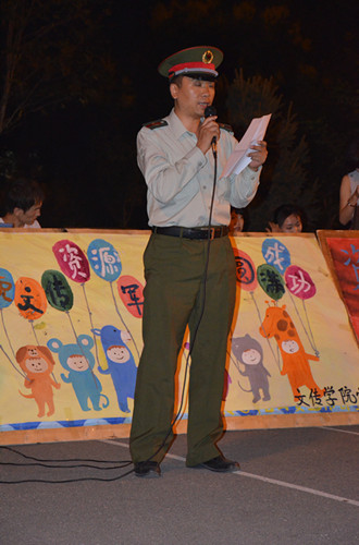 演出开始前,资源学院党委副书记薛冬钧讲话。首先,薛副书记对莅临演出现场的长安大学2012级军训师领导表示感谢,对资源学院和文传学院学生组织的精心策划、组织演出表示感谢。然后,薛副书记对新生寄予了深厚的期望,希望他们在训练期间认真训练,争先创优,把军训素养贯穿到以后生活当中去。接下来,慰问演出在热闹的腰鼓表演中拉开了序幕,惊险的轮滑表演、妙语连珠的对口相声、搞怪的口技表演,博得新生们阵阵热烈掌声;更有大一新生上台互动,挑战学长学姐的歌喉、口技;街头文化社带来的街舞表演和“渭水之星”冠军的深情献唱更是将现场的气氛推到高潮。