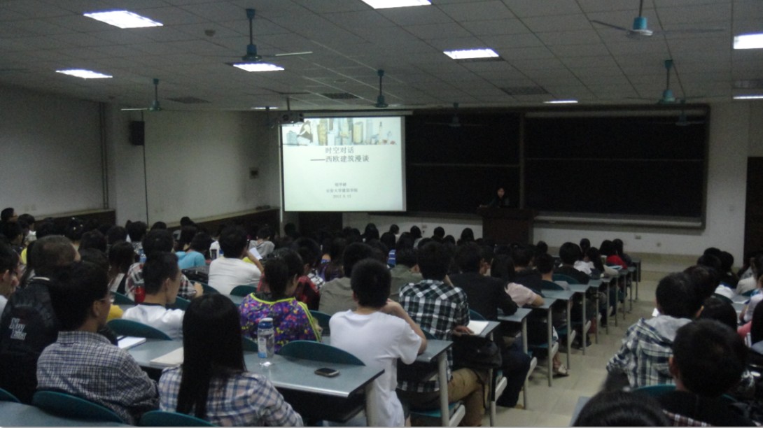2012年9月13日晚,长安大学建筑学院2012-2013学年“教师讲座”第一讲“时空对话——西欧建筑漫谈”在逸夫图书馆1102教室成功举行。建筑学院讲师杨宇峤老师主讲了此次讲座,建筑学院2010级、2011级建筑学学生与其他专业的学生参加了讲座。 晚19:00,讲座正式开始。杨宇峤老师首先向大家简要介绍了自身经历和资料来源。随后,以丹麦皇家图书馆、柏林犹太博物馆、柏林威廉纪念堂为例,从形式、功能、流线、空间、联系、景观以及整体规划、艺术手法等方面加以分析说明,并讲述了自己的实地感受。最后由同学们提问,老师予以解答。晚20:30,讲座结束。