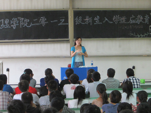 为了让新同学尽快适应大学生活,熟悉校园环境及学生管理制度,2012年9月15号,理学院团委书记、新生辅导员汤颖颖在修远4103教室面向125名2012级新生开展了新生入学教育。兼职辅导员姚如洋、王晓微,学生助理稽圣硙、刘春梅、郑圣平、刘键也参加了大会。