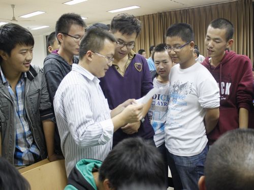 在王老师详细而又耐心的解答之后,会议进入第二个环节,三位老师分别和新生们进行了愉快的交流。李老师给大家分享了他在西北工业大学的求学历程,他鼓励新生树立远大目标,努力学习,为进入更深的学府而奋斗不息!与此同时,颜老师一边和同学们相互认识,一边向我们讲述他们在工作之余进行的科研实验。同学们在一旁听得津津有味,不时的提出一些问题,颜老师都耐心地一一解答。