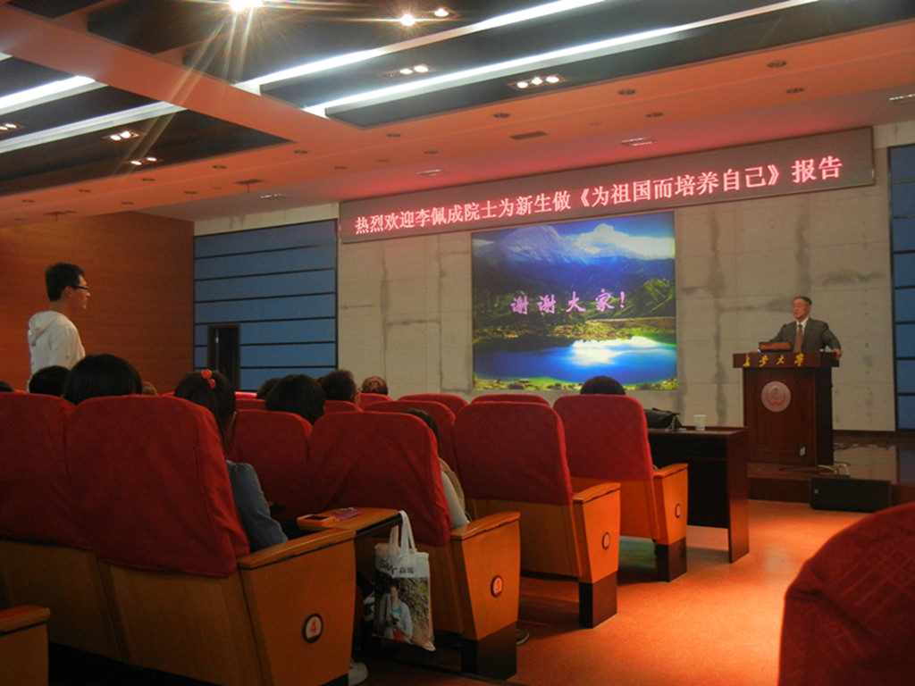 李佩成院士以"为祖国而培养自己"为主题,用简洁生动的语言提出自己对大一新生们的殷切期望.他从热爱国家,奉献社会,培养良好的学习习惯,保持自己的身心健康等方面,对同学进行了深刻的教导.李院士指出,要成长为优秀的人才,必须要努力地学习,思想道德与学术要同时发展,不忘报效祖国,回报社会。李院士的报告结束后,很多同学就自己的困惑进行了现场提问,李院士非常亲切地为大家一一解答。李院士表示,如果有需要,非常乐意再次来为同学们作报告,答疑解惑。