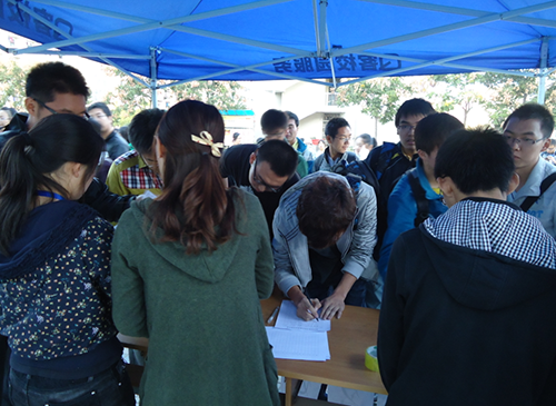 在我院服务队有序的组织下,10月15日上午9:00,工作人员分别在东西区食堂门口设好点,拉开了此次招募工作的序幕。12:00,报名的人数达到了高潮,一度出现现场拥挤的情况.在工作人员的组织下,秩序又回归正常。截至15日下午6:00,共有422人报名。16日早晨,工作人员如期到达,考虑到报名人员众多,工作人员又分别在东西区各增加了一个桌子,以保证现场秩序能够井然有序。现场一个同学说道:“这个活动好像很有意义呢,我们一起报把。”后面的几人都应和道:“好啊,一起报吧。”大家的积极性可见一斑。