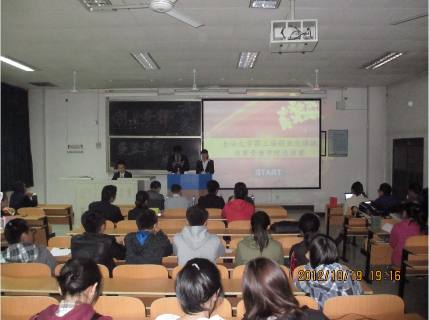10月19日晚七点,长安大学第三届创业先锋挑战赛资源学院选拔赛决赛在修远4102教室拉开了帷幕。出席本次比赛的嘉宾有长安大学校科协副主席田振坡、地测学院科协主席张增辉、资源学院科协主席王兴、资源学院科协副主席哈广浩以及陕西省第六届挑战杯创业计划竞赛省获奖者黄童童。