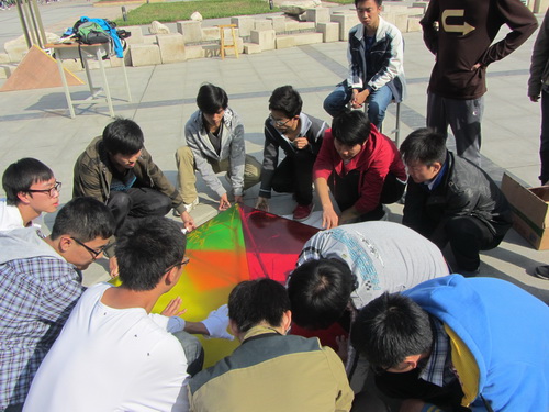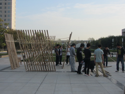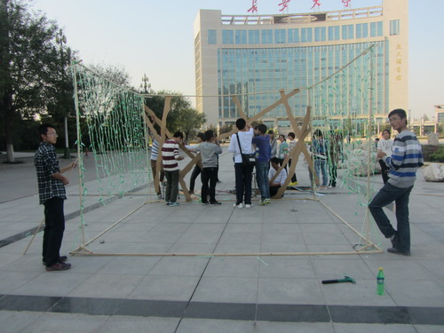 2012年10月24日,长安大学建筑学院第十一届建筑日实体搭建“交往空间*镜像”活动在渭水校区逸夫图书馆前的广场正式开始。进过前期充分的准备,各班开始按照自己的方案搭建心中交往空间。
