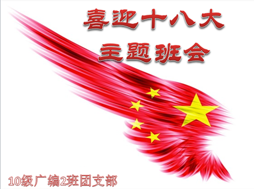 10月24日 下午,我院2010级广编二班在明远1301教室举行了“喜迎十八大”主题班会。就即将来临的十八大展开了热烈讨论。