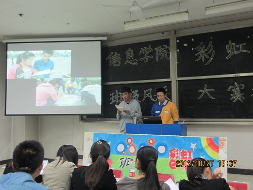 2012年10月27日下午,信息学院彩虹心理驿站(以下简称心协)于渭水校区修远2104教室举办了“彩虹e家”班级风采大赛初赛。此次比赛邀请了信息学院心协主席刘娜,建工学院心协秘书长罗琰,汽车学院心协主席雷蕾,环工学院心协主席李妍松,文传学院心协主席王庆龄担当评委。比赛由谭淇文、戴志明主持,共14个班级参加了初赛。