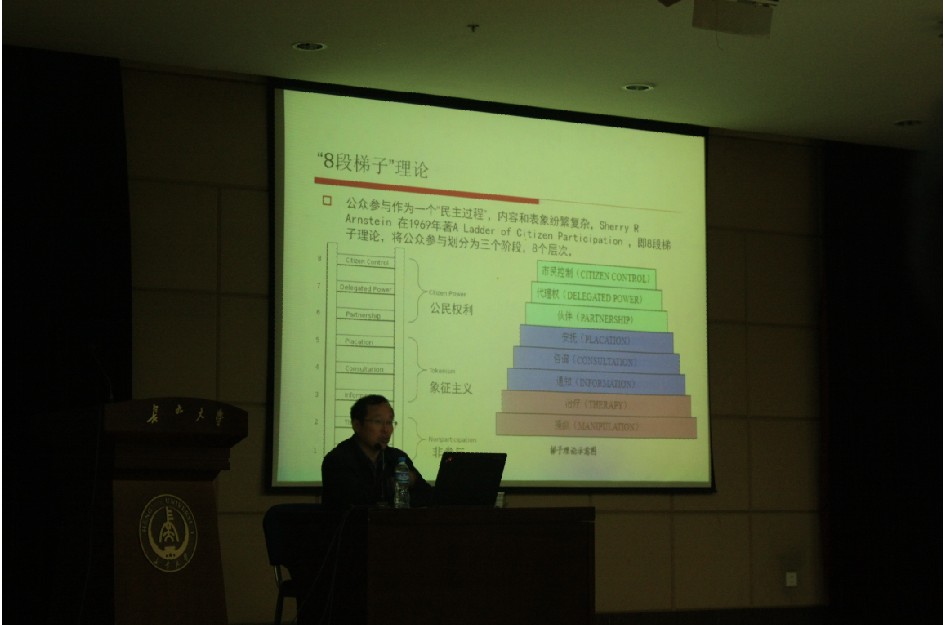 根据以上的思考题,沈迟教授以国外公众参与的理论与实践演进、我国城乡规划公众参与的背景、我国城乡规划公众参与的现状、我国城乡规划公众参与的展望等四部分展开了缜密而有严谨的论证与讲解。结合厦门海沧地区PX项目公众参与、伊宁市南市区保护与更新规划等的事例,向在座的各位同学讲解了公众参与对于城乡规划的重要作用。