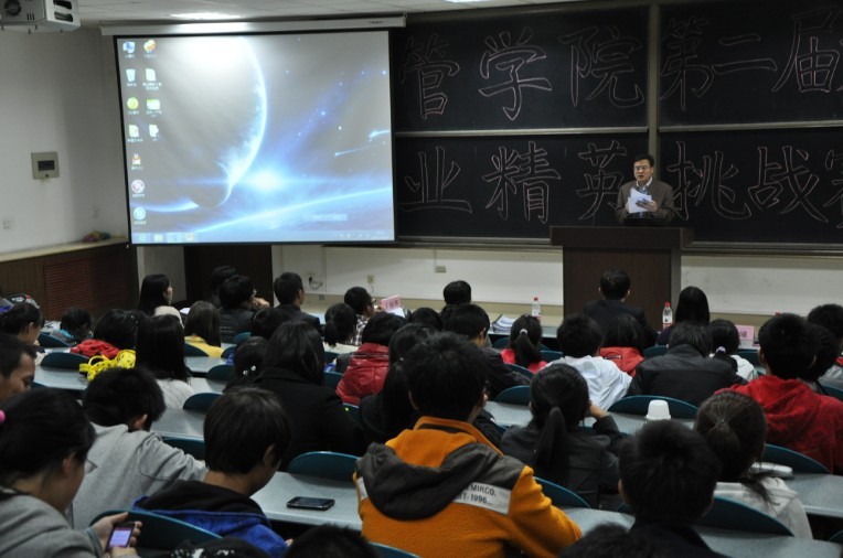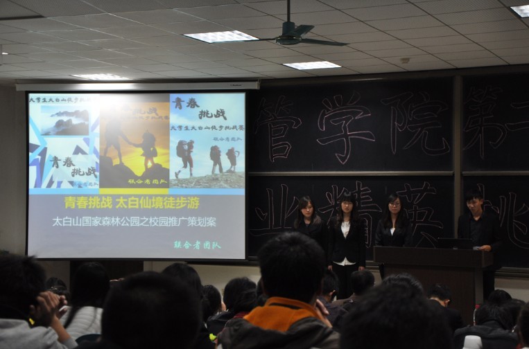 2012年10月30日晚七点,经济与管理学院第二届“太白山”杯商业精英挑战赛复赛于图书馆东1104教室准时开始。本届“太白山”杯商业精英挑战赛由西安外国语学院商学院主办,长安大学、西北大学、西安邮电大学、西北政法大学、西安电子科技大学、西安工业大学、西北工业大学、西安建筑大学、陕西师范大学等多所高校共同参与协办。长安大学赛区比赛由经济与管理学院组织承办。本次“太白山”杯商业精英挑战赛面向广大在校大学生,旨在从广大学生群体中挖掘寻找出最适合推广太白山旅游的营销策划。出席本次大赛的嘉宾评委有王丽萍老师,樊根耀老师,夏明学老师以及10级辅导员喻曦老师。