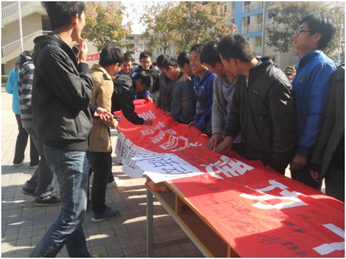 工程机械学院2011级机制五班全体成员于2012年11月5日在西区饭堂门口举行横幅签字,喜迎十八大,为自己的祖国送上最诚挚的敬意。
