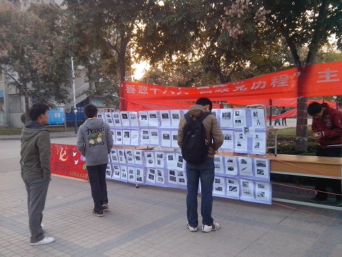 11月6日西区食堂门口,迎十八大活动到了最关键阶段,中午许多同学写了祝福,看了展板。早上六点未到,活动主办方机制五班的同学就冒着寒气,忍着饥饿把一切准备就绪,这有祝福语展板,有图展,有横幅。中午吃饭的同学们陆陆续续来围着展板,来写上了对祖国和党的祝福,祝福语写满了展板,便利贴又贴满了一层,这些祝福语都表达了他们对祖国和党的爱,对祖国和党的期待。然后他们又挤着去看图展,图展内容有中国这几十年军事、科技、民生等方面的发展,同学们津津乐道地讨论着,热闹非凡。