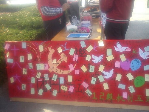 机制五班的同学满怀激情地办着这次活动,其他同学也衷心地祝愿着祖国和党。
