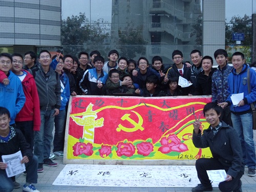 我院12级机械设计制造及其自动化1班于2012年11月7日下午,在西区食堂门口举行了以“喜迎十八大,紧跟党步伐”为主题的团日活动。