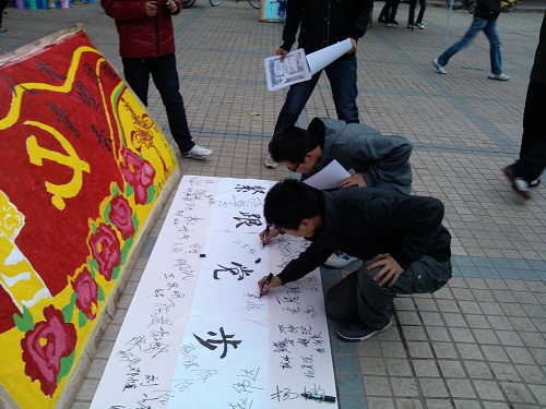在食堂门口,我团支部以宣传版画、播放红色歌曲等形式向大一、大二同学们宣传了党的十八大精神,并对同学们进行了专题采访。最后团支部号召大家进行了签名,同学们的表现格外热情。