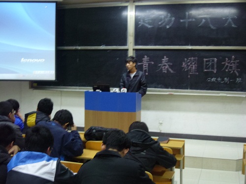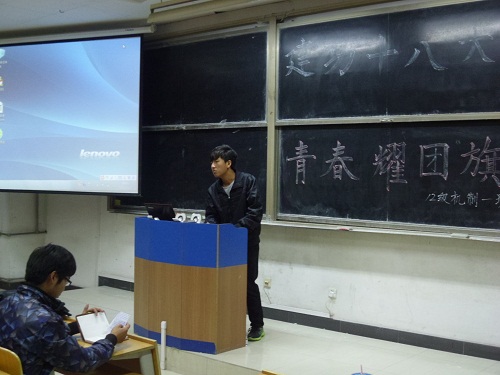 班委提早到场,精心布置了教室。黑板上“建功十八大,青春耀团旗”几个大字格外显眼。活动过程中,大家营造了轻松愉快的氛围。在班会开始时,兼职辅导员边晓伟给大家讲述了党的有关知识,同学们纷纷表示收获颇大。随后,团支书和班长共同带领同学们进行了热烈的讨论。班会在活跃的气氛中圆满结束,同学们都意犹未尽。