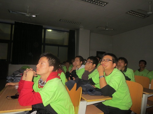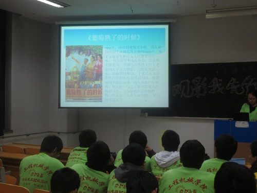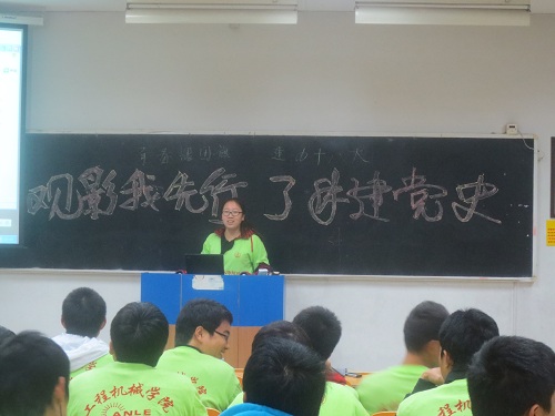 2012年11月7日 ,机械设计制造及其自动化四班全体同学在修远3201举行了“青春耀团旗 建功十八大”主题团日活动的第二个活动“观影我先行,了解建党史”综合活动。