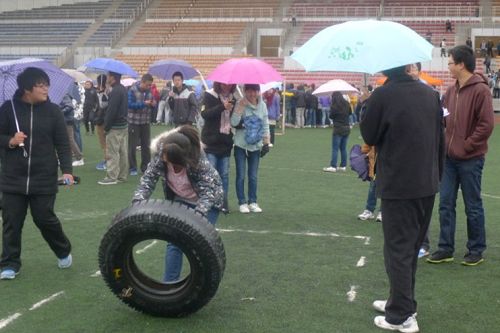 天气阴冷,下着小雨,从清晨6:00开始,建工学院学生会和团委的工作人员就已经开始了紧张有序的准备工作。比赛按班级分批进行。7:30,天蒙蒙亮,参赛班级排着整齐的队伍,陆续进入场地。8:00,比赛正式开始,大家满怀激动的心情,在热情洋溢的操场中,踊跃的投身到各项目当中去。今天的比赛除了100m,400m跑步等常规项目外,还有小推车,3分钟踢花键,50m行进间单摇跳绳及荷球投篮等趣味项目。