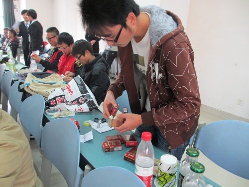 下午一时,比赛正式开始。比赛共分三个环节,大赛的第一项为自选答题,回答的正确与否将决定各队所改造的旧物。此环节中,参赛队员们各显神通,纷纷选到了“心仪”的旧物,同时也为大赛的结果设下了悬念。其后进行的是旧物改造环节,各队充分发挥想象力利用所获得的旧物制作一份与“光棍节”主题有关的作品,整个比赛的场面可谓是热火朝天。在一个小时的制作过程后,一个个富有创造性的作品成列众人面前,旧军服改造的海绵宝宝博得了在场观众的热烈掌声,富有新意的心型板凳则充分体现了制作者的心意。接着,各队代表上台对所完成的作品进行了解说,各队精彩的解说让现场的气氛再次达到顶峰。最终,经评委商定,大赛了决出一等奖,二等奖等多个奖项,大赛至此圆满结束。