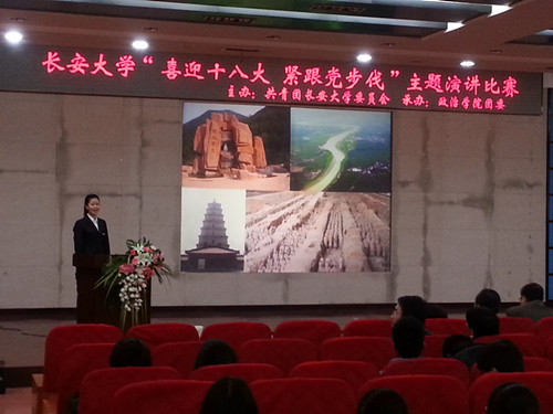 11 月 7 日晚 7:00,长安大学第十二届大学生文化节之"喜迎十八大,紧跟党步伐—假如我是一名学生主席"主题演讲比赛决赛在渭水校区会议中心二楼报告厅成功举办。我院12级信息与计算科学专业何欣同学入围决赛并荣获二等奖。
