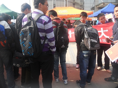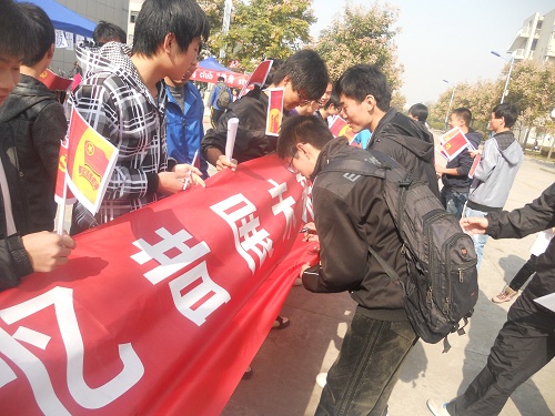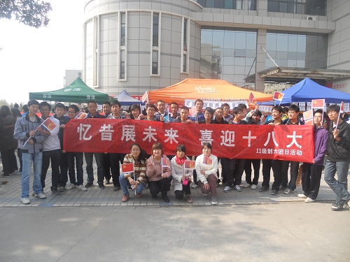 我院2011级机制六班全体成员在今日下午2:00开始在西区食堂东门口进行本次团日活动的最后一个内容----对本次团日活动做最后的宣传,喜迎十八大。大家都知道,中共十八大在今天隆重开幕,所以我们班借此伟大的时刻,再一次对十八大进行宣传,迎接十八大的召开。