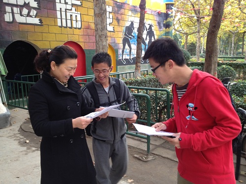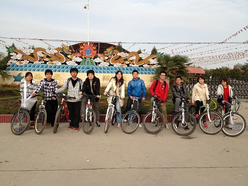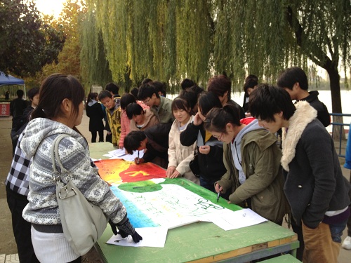 在活动中,我们班部分同学穿着DIY彩绘T恤,从学校出发骑行自行车抵达未央湖公园后在公园门口向路人发放了“预祝十八大圆满召开的宣传单”、 “锻炼身体、保护环境从增大自行车/汽车的商做起”的绿色出行倡议书,并邀请行人在展板上签字。