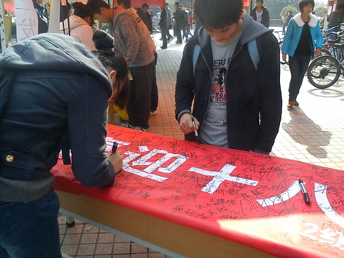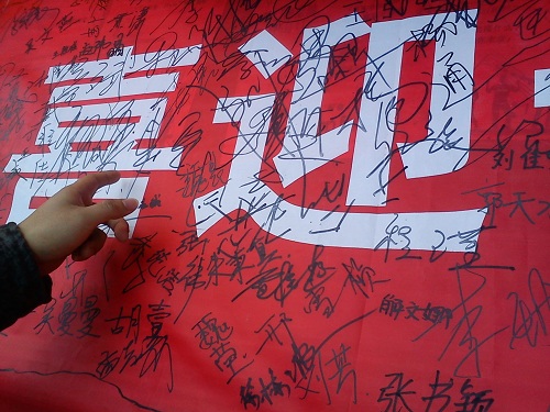 我们这一活动在同学们中引起了较好的反响,比较收欢迎,到活动快结束时,条幅上签满了密密麻麻的名字,在条幅的衬托下,更显庄严。