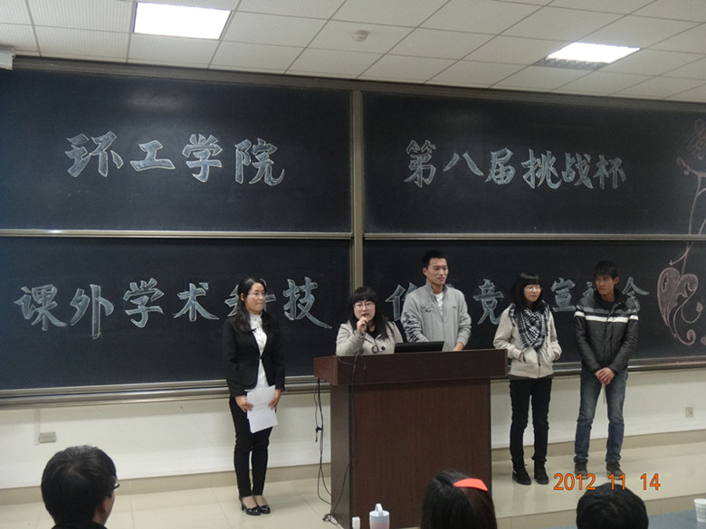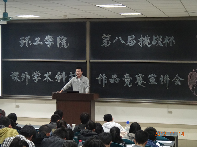 2012年11月14日19:00,由长安大学环工学院科技创业与创新协会主办的,环工学院第八届“挑战杯”课外学术科技作品竞赛宣讲会在WT1104教室顺利举办。环工学院已立项参加第八届“挑战杯”课外学术科技作品竞赛的四位队长作为嘉宾参了加此次宣讲会。