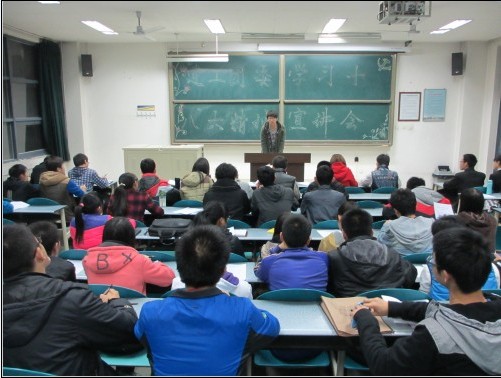 2012年11月8日晚七点,长安大学建工学院团委于渭水校区明远1205召开了学习十八大精神宣讲会。参加本次大会的有建工学院团委副书记张天成同学、书记助理陈美玲同学、建工团委各部部长及全体干事。本次会议分发了学习材料(十八大七大看点),围绕学习和宣传十八大精神展开。
