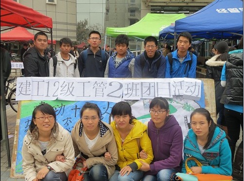 为了积极响应校团委“喜迎十八大”的号召,并大力宣传十八大有关生态文明的提议,积极参与到团委组织的团日活动中来,建工学院12级工程管理2班于11月19日在西区食堂门口举办了主题为“建功十八大,支持生态文明你我同行”的团日活动,全班同学参与到了这次活动之中。