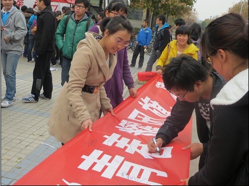 活动之前,我们进行了内部分组与分工,设计了展板,制作了传单,准备了横幅用于签名活动,并对活动后总结人员进行了安排。19日中午十二点,我们准时在西区食堂门口进行宣传,主要形式为发传单。横幅上几个醒目的大字“青春耀团旗,建功十八大”映入同学们的眼帘。在我们的宣传下,同学们纷纷在横幅上签下了他们的名字。传单的发放让大家对生态文明有了一定的了解,同时也对我们班的团日活动有了一定的了解。随着横幅上的名字越来越多,我们班的团日活动也接近了尾声。最后,班上的同学合影留念,记下了这值得回忆的一刻。