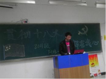 为了学习贯彻党的十八大精神,把党的十八大精神学习得更加深入,2012年11月18日晚信息学院11级网络一班在修远3403教室举行了以“贯彻十八大,党辉在我心”为主题的团日活动。