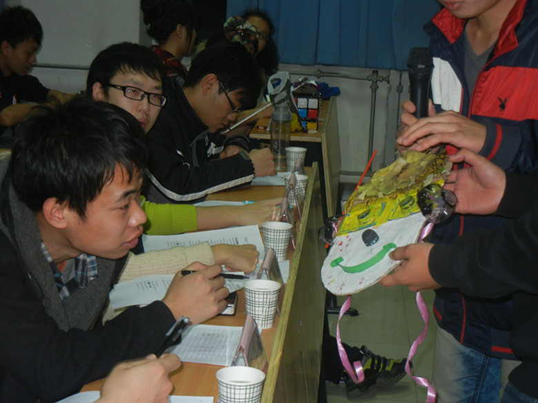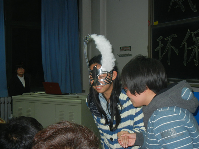选手们依次上台细心地讲解着自己的精心准备的面具作品,向现场的评委们陈述着自己创意的来源以及自己作品的独到之处。他们用枯叶,塑料瓶,废旧的羽毛球等这些大家司空见惯的废物制作出华美的面具,让现场的观众一饱眼福。台下选手们认真倾听着台上选手的讲解,评委们向选手询问关于他们作品的相关问题,用深入的赏析给予选手公正的评价。充满创意,新颖精美的面具和选手赋予它们的深刻内涵博得了台下观众一阵阵热烈的掌声。