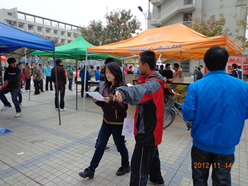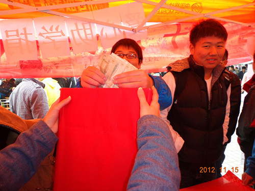 上午11点,同学们在西区食堂门前布置好场地,在食堂周围发放本次活动的宣传单,对本次活动进行大力宣传。中午时分,很多学生都前来进行捐款,并在我们的宣传横幅上签名。活动现场气氛活跃,才两个小时签名布上就写满了名字。本班同学也进行了自发捐款活动,结果一共募捐得130.60元。晚上,班级团支部通过学院青联把活动捐款移交给学校青总爱心包裹队,把爱心送给西部贫困地区的孩子。