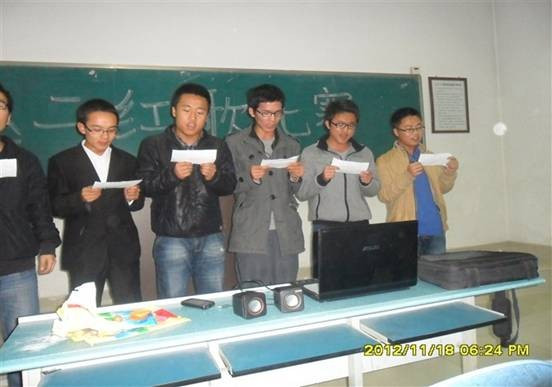 公路学院2012级隧道二班全体同学于11月18日晚在明远3307教室拉开了以“隧2红歌比赛”为主题的团日活动的序幕。