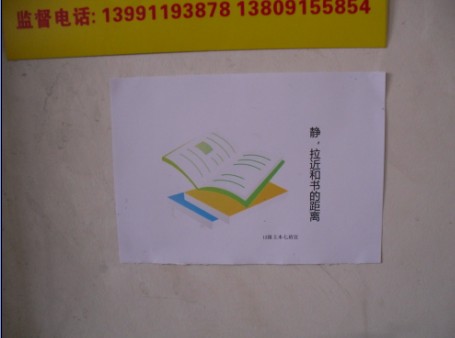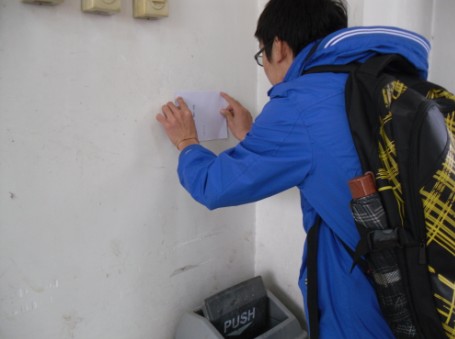紧接着,各组成员开始了各自的张贴活动。同学们按顺序前往目的地开展标语张贴活动。有关维持教室安静气氛的标语张贴在修远教学楼的各个教室内,以便提醒同学们保持安静,提高学习效率。有关自行车摆放的标语被张贴在西区各个学生公寓楼下,意在提醒大家按顺序将自行车摆放整齐。有关节水的标语被张贴在教学楼内卫生间中,以增强大家的节约用水意识。大家热情参与其中,气氛积极活跃。