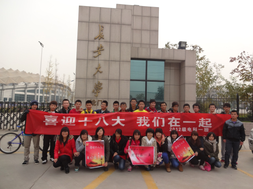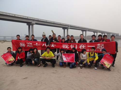 为欢庆党的十八大胜利召开,我院12级电科一班团支部于2012年11月22日在渭河附近举行了以“喜迎十八大 我们在一起”为主题的团日活动,活动形式是开展相关游戏并进行垃圾清理。