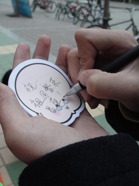 本次活动的宣传活动于11月14日下午在树蕙园广场开展,由本班班干部带领热心同学通过横幅、宣传板、签名、留言等方式向来往同学宣传党和十八大及本次团日活动,并取得圆满成功。