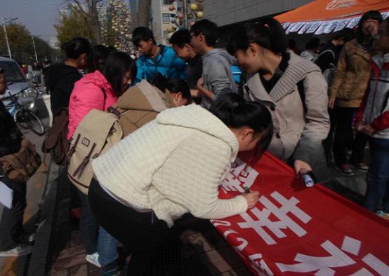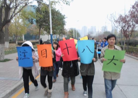 本次团日活动由2012级环境科学班团支部主办,从11月11日开始筹办,参与策划的是12级环科班班委。宣传活动从15日开始,为期两天。15日同学们拉着横幅,举着标语从东区游行到西区进行宣传,16日宣传主要地点在东区树蕙园广场,吸引路过的同学在横幅上签下自己的名字及张贴自己的幸福便签。