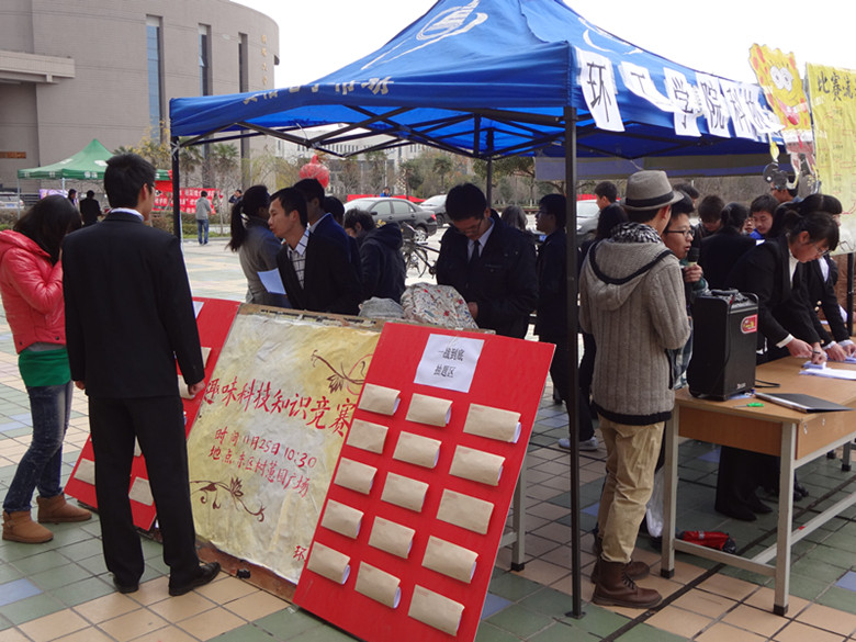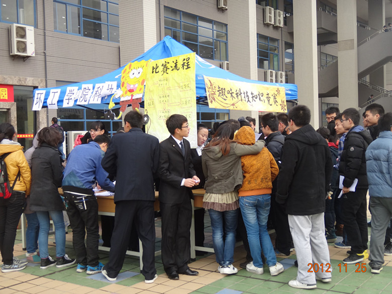 2012年11月25日10:30,由环境科学与工程学院科技创新与创业协会主办的趣味科技知识竞赛,在长安大学东区树慧园广场正式拉开序幕。 此次竞赛旨在更好的宣传科技文化,营造良好的科创氛围。比赛采用了闯关模式,共有三个环节,依次为:“唾手可得”、“扭转乾坤”、“一战到底”。题目围绕科普知识展开,贴近生活,简单有趣。采用现场抽题、现场作答、主持人现场揭晓答案的形式,参赛选手每完成一个环节,可以选择领取奖品,或是承担风险继续闯关。 虽然天气寒冷,但竞赛一开始,就吸引了大量的同学报名参赛。随着宣传活动的开展,活动现场变得更加热闹。前来参赛的同学络绎不绝,抽题答题区排起了长队,负责本次活动的工作人员也忙得不亦乐乎。比赛现场的同学们,有的胸有成竹、沉着应对;有的冥思苦想、豁然开朗;有的权衡轻重,谨慎抉择。成功晋级者,满载而归;错失良机者,也毫不后悔。 13:00,趣味科技知识竞赛圆满结束。本次的知识竞赛,将科技与趣味完美的结合,平日被学生认为枯燥无味、遥不可及的科技知识变得生动鲜活起来。共吸引了东区200余人参与其中,在轻松愉悦的氛围里,学习到科技知识,感受到科技对于生活的重要意义。