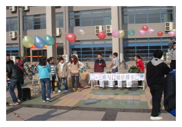 2012年11月17日,长安大学环工学院2012级给排水卓越班在渭水校区树蕙园广场成功举办了“青春耀团旗,喜迎十八大”团日活动。参加活动的除了环工学院2012级给排水卓越班以外,还有2011级给排水2、3班全体团员及部分其他渭水校区团员。