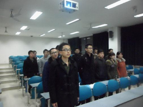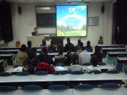 首先,信息班全体同学开展了主题班会。先是放国歌,全班合唱国歌,然后全班同学在团支书带领下一起学习了《党章》,加深了班里每一位同学对党的认识。接下来,同学们一起了解了党的历史 ,学习了十八大的相关文件,了解十八大精神。最后,同学们一起观看了有关十八大的视频。班会在经典红歌的音乐中结束。