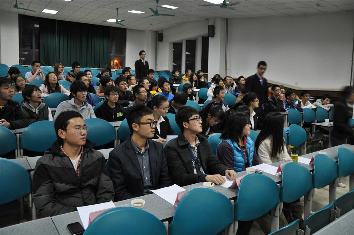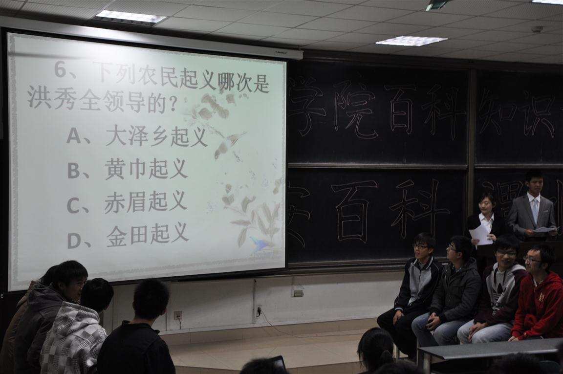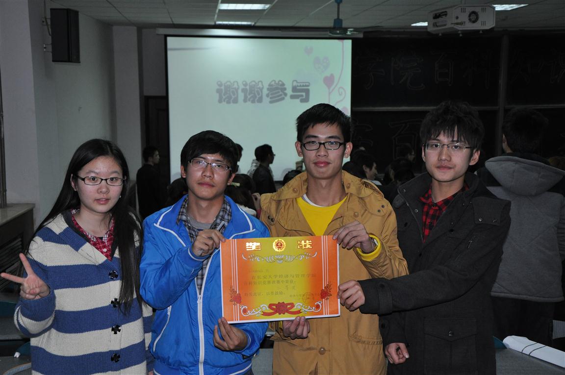 2012年11月23日晚七点,经济与管理学院“长安百科,渭水才情”百科知识竞赛决赛于图书馆1101教室准时开赛。本次比赛邀请了经济与管理学院学生会、心协与科协三个组织的主席团成员担当嘉宾。 参赛的十二支队伍首先进行了队伍介绍,展示自我风采,提高队伍士气。本次大赛设有正式比赛环节与观众互动环节,场上选手表现精彩,力夺比分,台下观众积极抢答,妙趣横生,现场气氛热烈活跃。伴随着热烈的掌声,嘉宾为获奖队伍颁发奖状,并合影留念。 至此,经济与管理学院百科知识竞赛顺利举办,此次比赛不仅丰富了大学校园生活,也增强了同学们对百科知识的兴趣,为鼓励同学们汲取多方面综合知识营造了良好氛围。于此祝贺经济与管理学院百科知识竞赛圆满落幕。