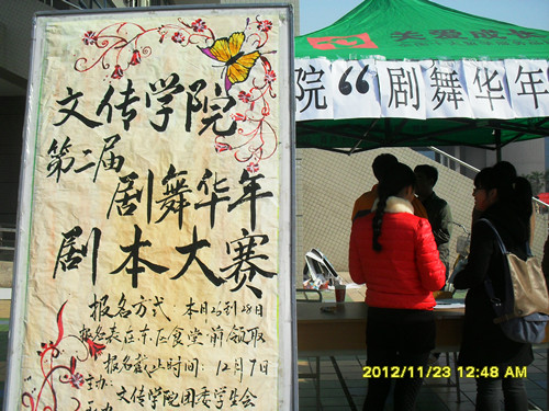11月27日 ,由我院学生会主办,院大学生艺术团承办的“剧舞华年”第二届剧本大赛在东区食堂进行宣传和报名征集。